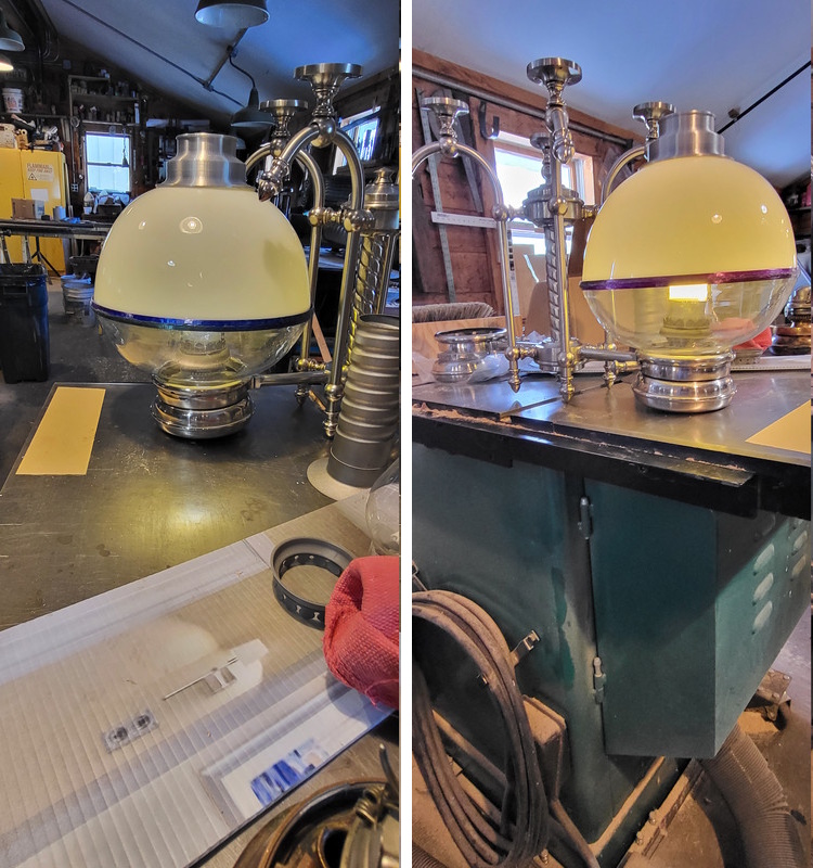 Jason Lamontagne found a source for the lamp globes. They are in two parts, the top half milk glass and the bottom half clear glass. The two halves are held together by a stainless steel band. Eric had to drill the clear glass to enlarge the hole. This was done with a diamond hole saw working underwater.