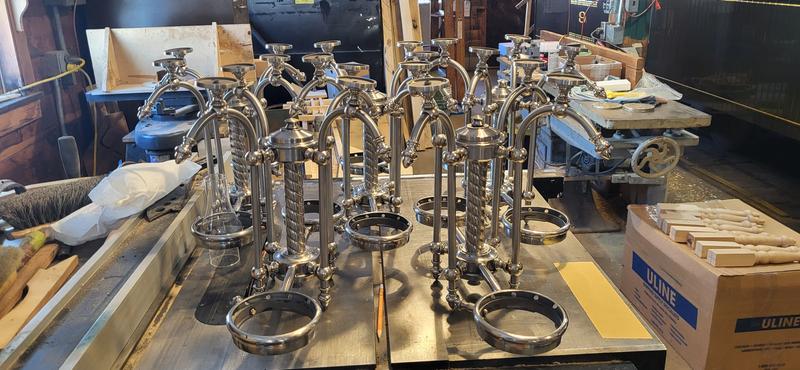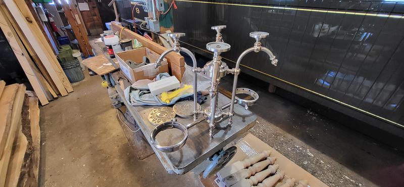 Work continues on construction of the chandeliers for coach 9. Ron Ginger has built six of them in his home workshop. Three will go in coach 9. Three will also go in coach 3, when it gets restored.
