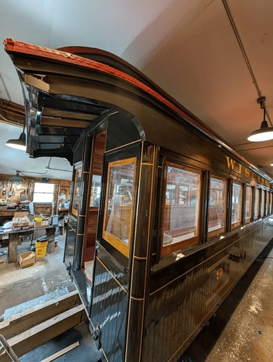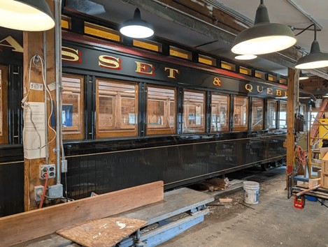 Remember, we need a total of $120,000 to Finish Coach 9 to the Nines! These expenses include paying for the $30,000 paint, varnish, and gold leaf finish, chandeliers (at $3500 each), seats ($850 each), Miller Safety Platform and coupling system, Wood’s Safety Gates, passenger trucks with vacuum brakes, hat racks, and many other final details. If support is not received, this project is in danger of stalling – so please help if you are able to do so.