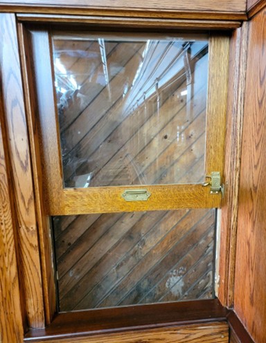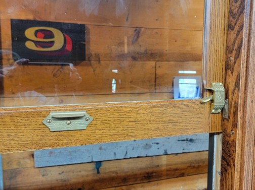 Next, finished wooden molding strips are fastened to the inside of the coach to form part of the tracks in which windows will slide. Once it is determined that the windows are sliding freely, the hardware is attached to lift the windows and latch them open. These brass pieces are replicas of the hardware that is found in coach 3.