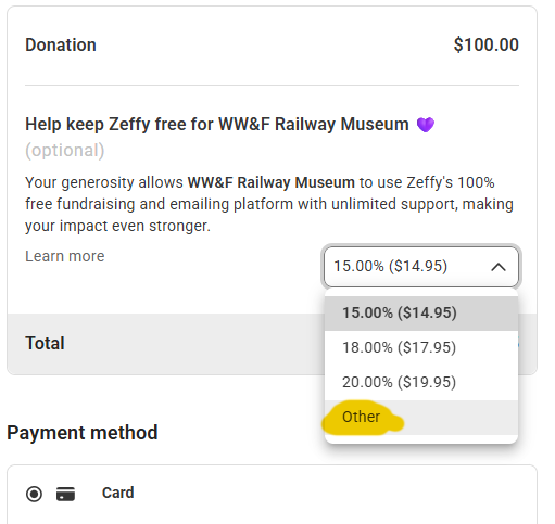 We use Zeffy as our fundraising and ticketing platform because the fee that is collected from the donor (or ticket buyer) is completely optional. If you do not want to assist Zeffy’s mission in providing this service to the WW&F (and other great non-profits) select: “Other”…